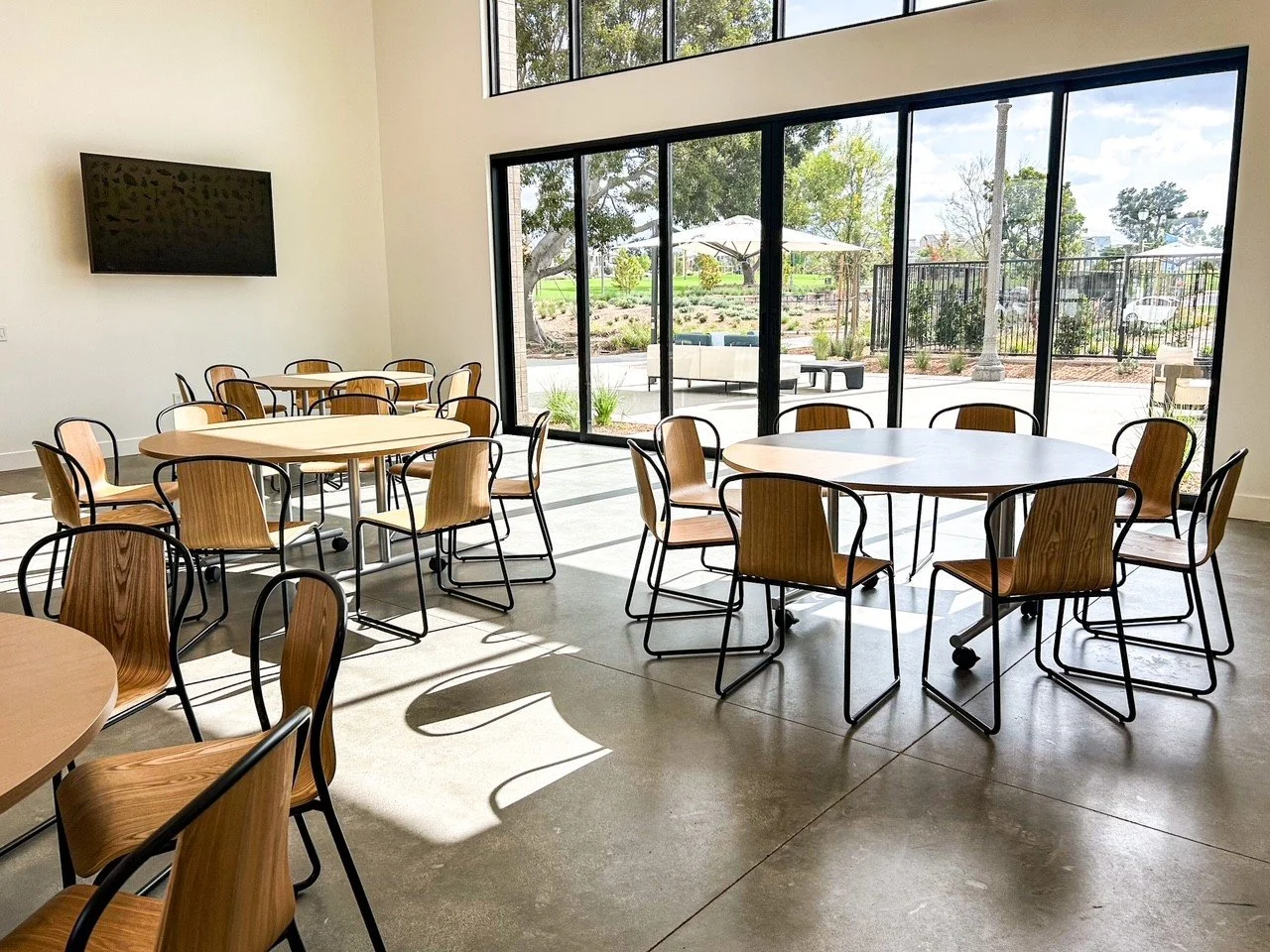 Indoor Includes: Multipurpose Room- Rectangular Tables (3), 60-in Round Tables (6), Stackable Chairs (48), Smart TV (1), Large Sliding Glass Door (1) Studio- 48-in Round Tables (4), Stackable Chairs (20), Smart TV (1), Kitchen- Microwave (1), Refrigerator (1)